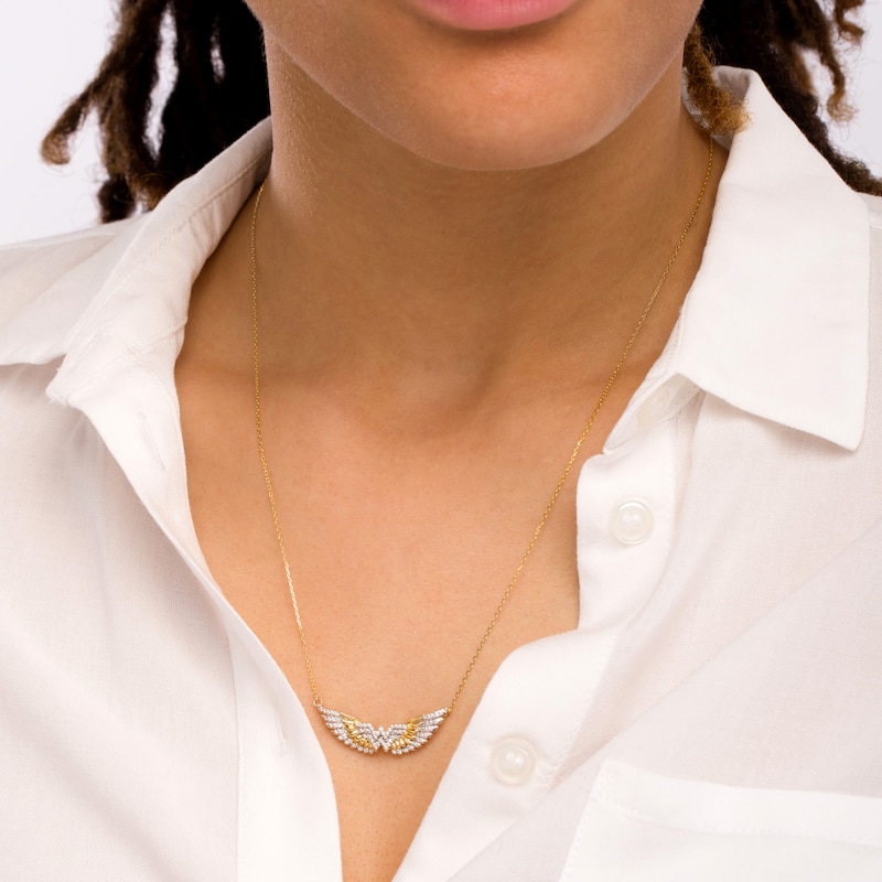 A striking style, this diamond necklace displays your confidence and strength. Created in warm 10K gold, this bold choice showcases the logo lined with sparkling diamonds. Highlighting the center, polished and diamond-adorned feathers shine in a layered wing design. Radiant with 1/4 ct. t.w. of diamonds and a brilliant buffed luster, this look suspends centered along a 16.5-inch cable chain that secures with a spring-ring clasp.This exclusive fine jewelry collection inspires you to wear your strength, confidence and power.