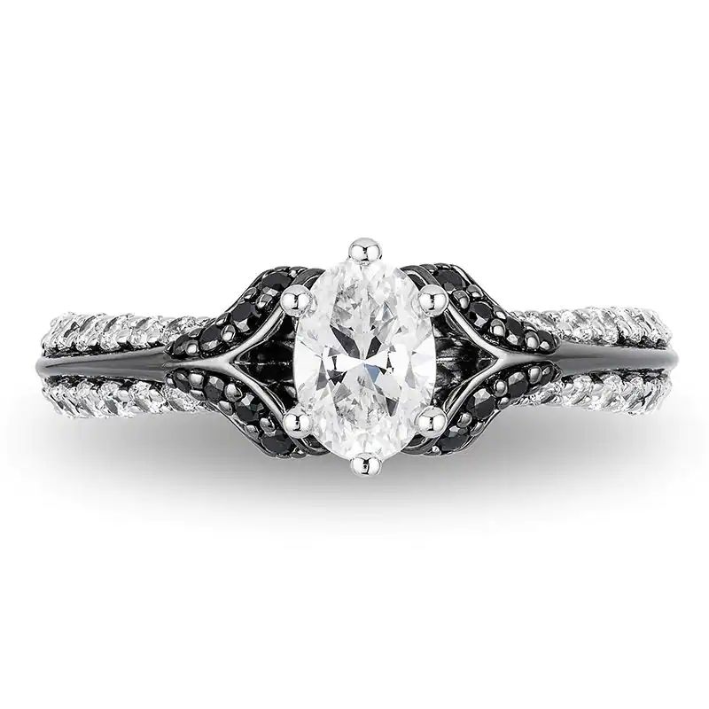 - Des colliers en rhodium noir en forme de chevron soulignent la pierre centrale avec des diamants noirs.