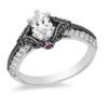 - Deux rangées de diamants scintillants le long de l’anneau et deux rubis rouges vifs sertis à l’abri sous la galerie ornent ce design épique.