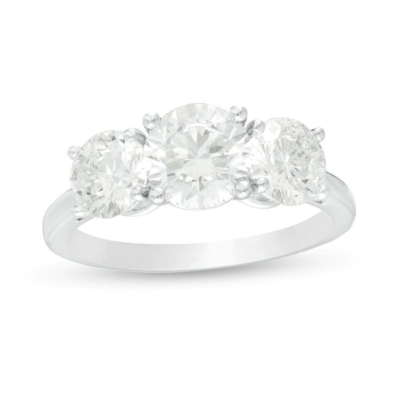 As timeless as your love, this beautiful engagement ring is ready to surprise and delight. Fashioned in 14K white gold, this blissful look features a majestic 1-1/2 ct. certified diamond flanked by a pair of shimmering 3/4 ct. certified diamonds, each boasting a color rank of G and clarity of SI2. Engraved inside the band and set with two accent diamonds, the words « Past, Present, Future » remind her of your promise to be by her side, always. Breathtaking with 3 cts. t.w. of diamonds and a brilliant buffed luster, this three-stone engagement ring makes the moment magical. This style arrives with a certificate that includes a photo and description of the diamonds, which guarantees quality and can be used for insurance purposes.This item is electroplated with rhodium or finished with an e-coating. These finishes may wear off with frequent use. Ask a jewelry consultant for details.