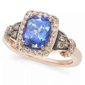 A striking cushion-cut Blueberry Tanzanite? (2 ct. t.w.) makes a cool contrast to the warm tones of Nude? (1/3 ct. t.w.) and Chocolate Diamonds? (1/8 ct. t.w.) set in rich 14k Strawberry Gold?
