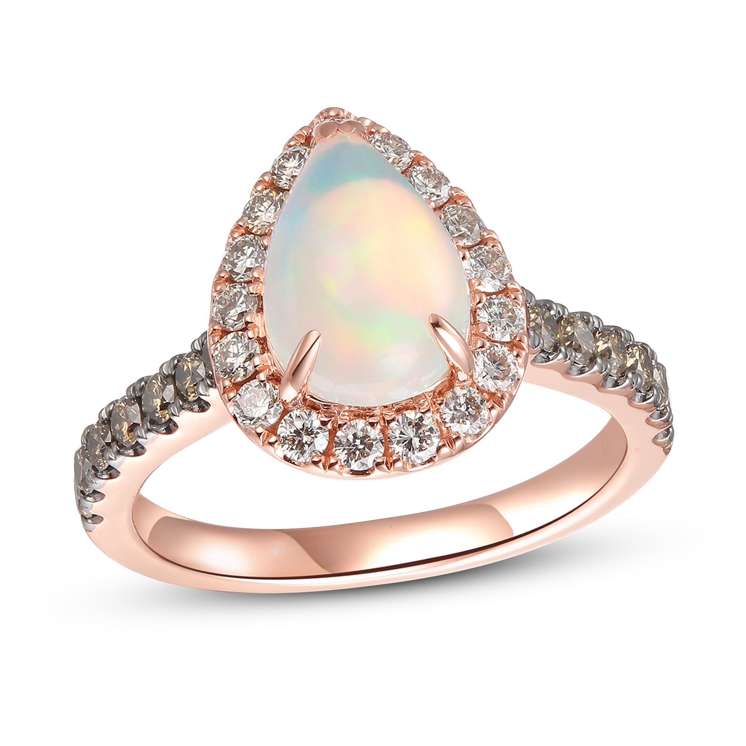 Veuillez noter : Cette bague est disponible en tailles limitées. Si vous ne trouvez pas votre taille ici, veuillez vous rendre en magasin pour commander votre bague. Un opale napolitain de forme poire ? vole la vedette dans cette magnifique bague pour elle. Des diamants Nude étincelants ? encadrent la pierre centrale, tandis que des diamants Chocolate ? ornent l’anneau en or fraise 14 carats ?. La bague présente un poids total en diamants de 3/4 carat. Découvrez la légende.