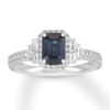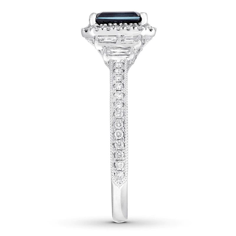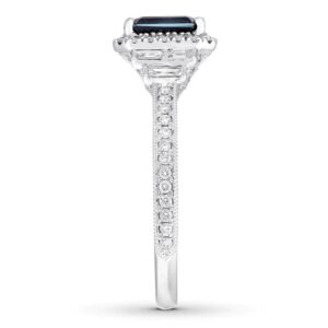 La créatrice de bijoux réinterprète le style Art déco dans une esthétique moderne avec cette bague de fiançailles exceptionnelle. La pierre centrale, un saphir naturel taille émeraude, est entourée de diamants ronds, tandis que des trios de diamants baguette scintillent de chaque côté pour compléter harmonieusement le design. L’anneau présente davantage de diamants ronds, une délicate grenure et des ornements ciselés qui parachèvent l’ensemble. Réalisée en or blanc 14 carats, cette bague possède un poids total en diamants de ½ carat.